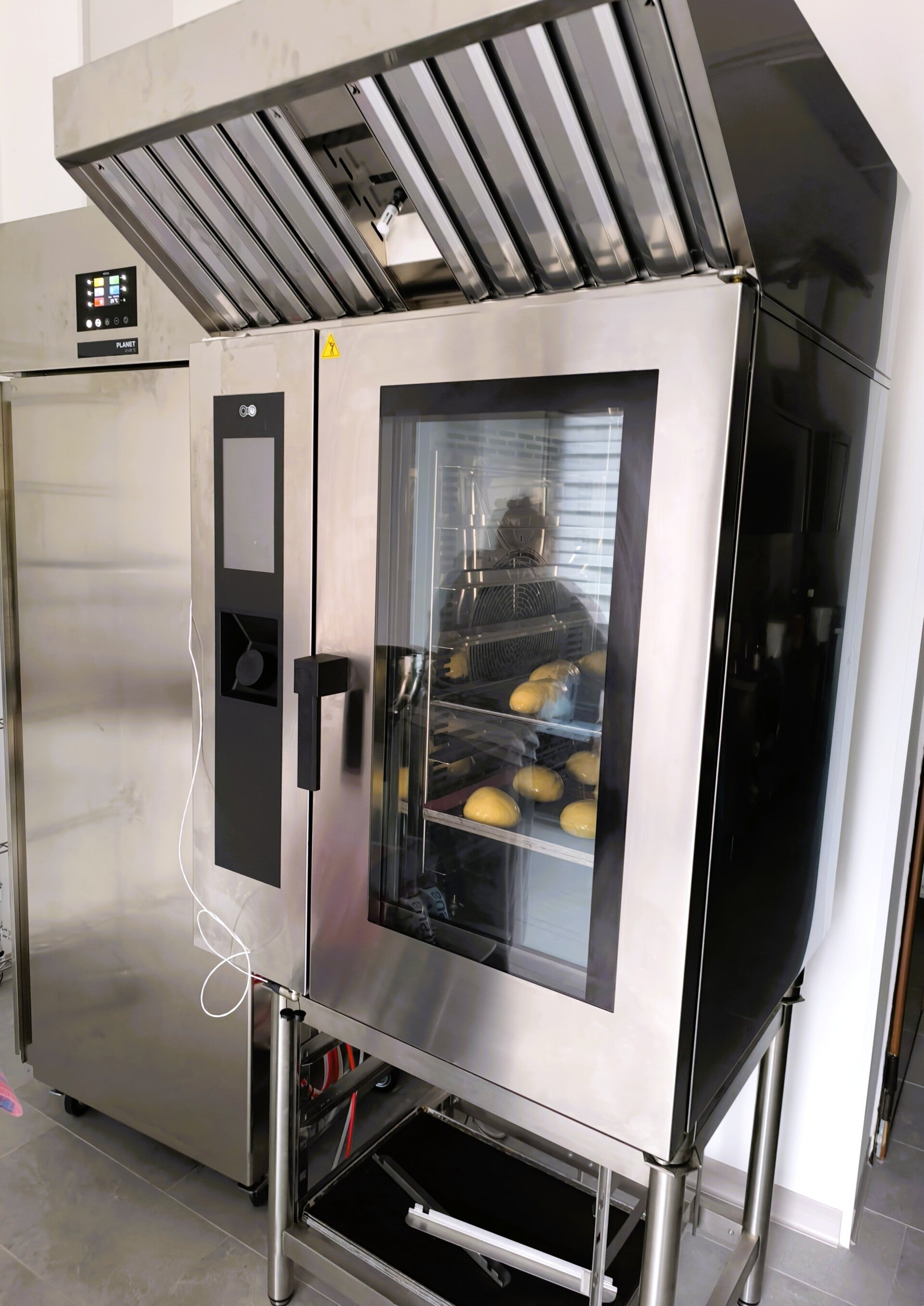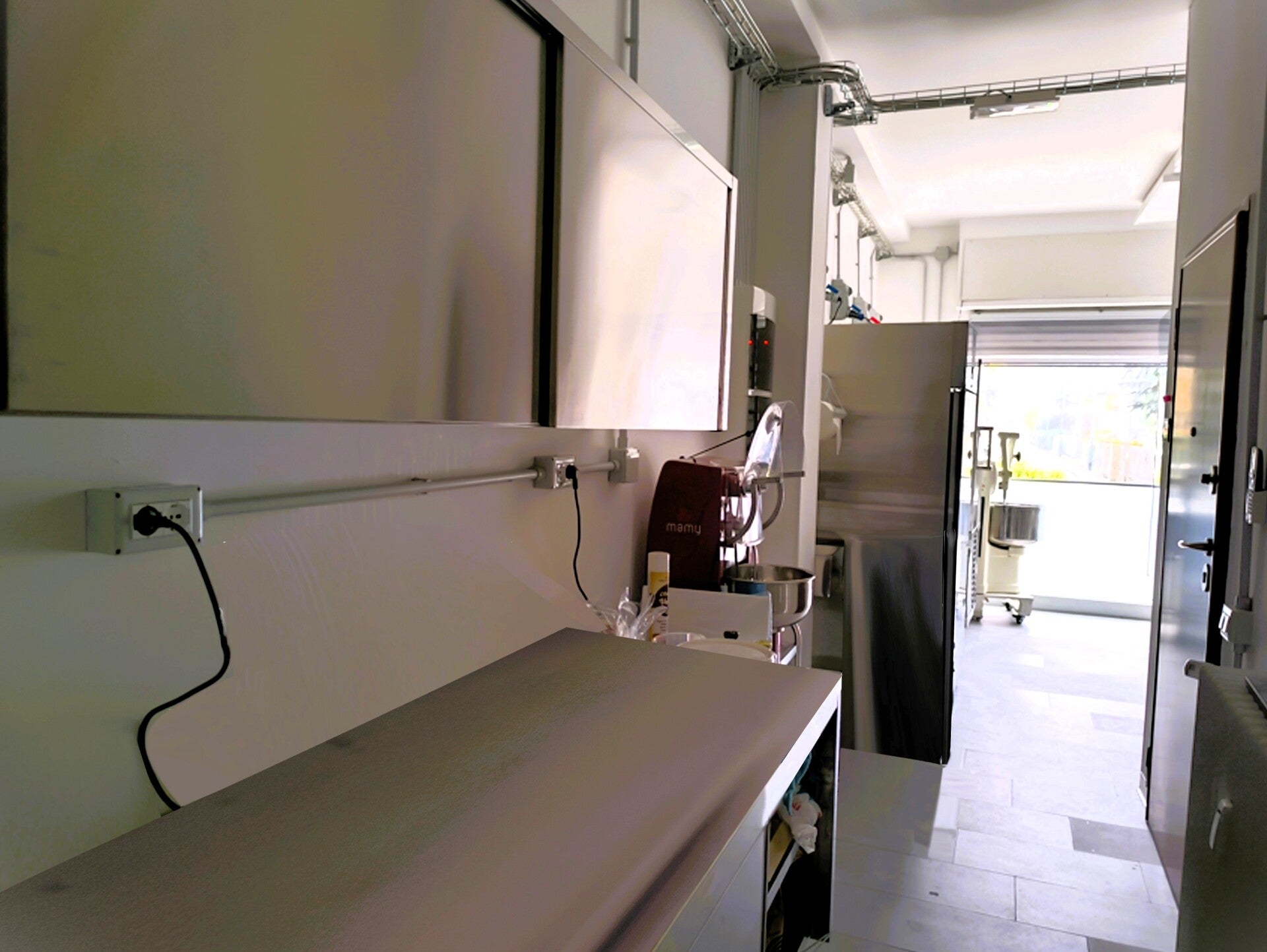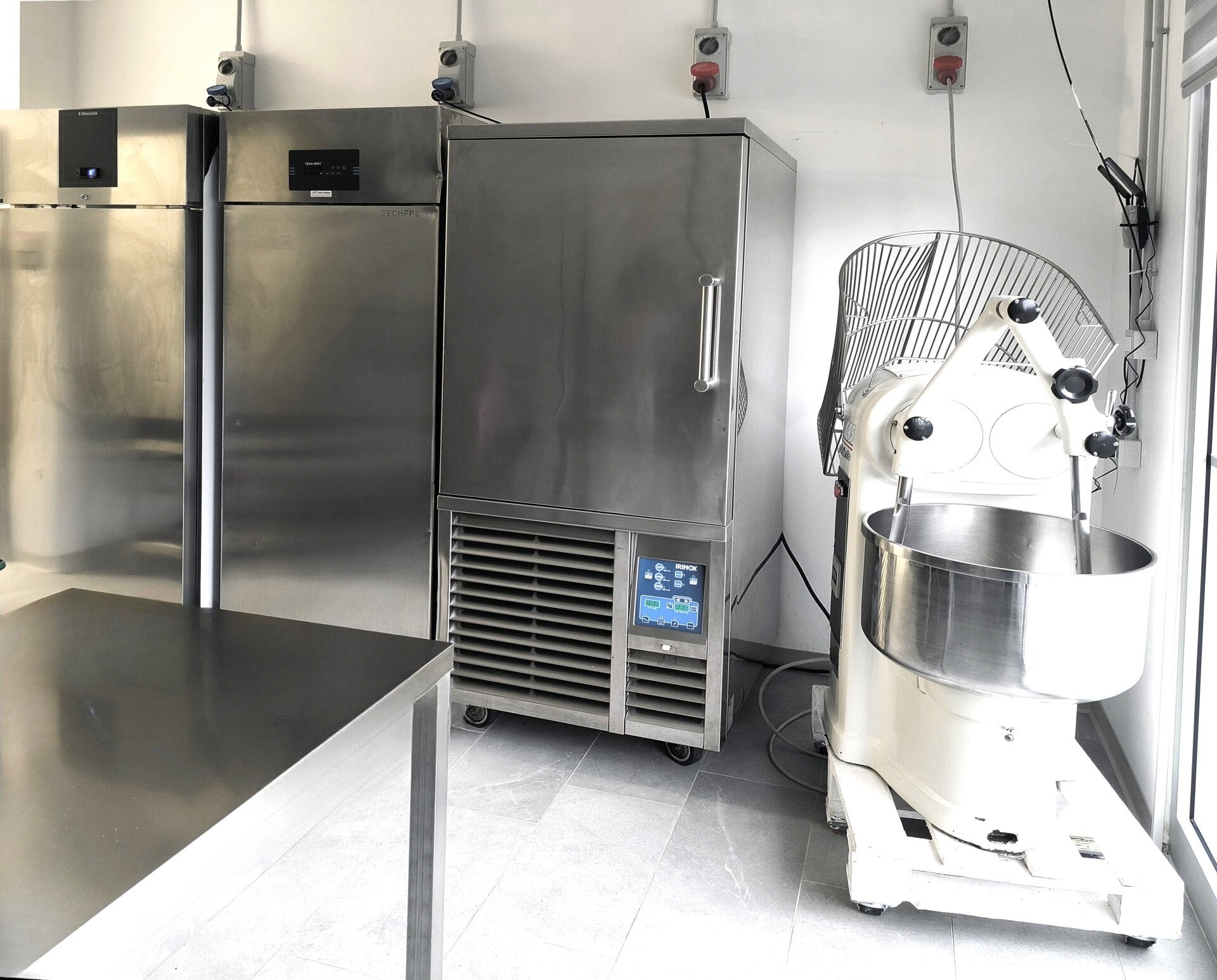il laboratorio è attrezzato con forno accoppiato ad una cappa automatica , lievitatore, abbattitore, frigo positivo, frigo negativo (conservatore) due impastatrici a braccia tuffanti e due aree di lavoro