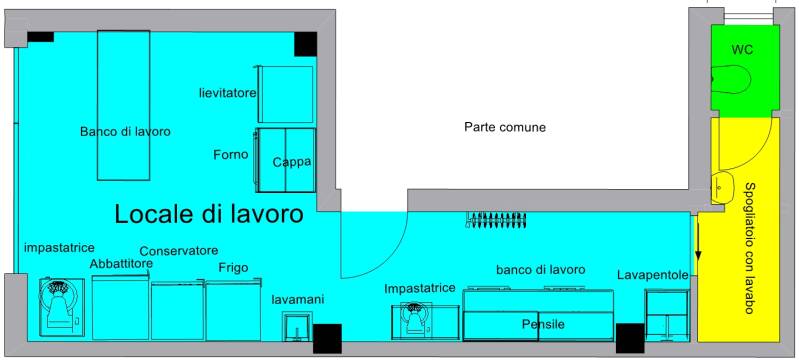 Nella planimetria successiva potete osservare le attrezzature presenti e la loro disposizione nel locale di lavoro